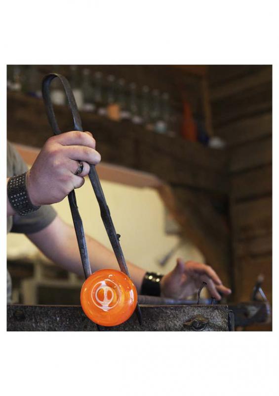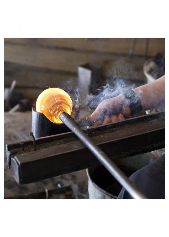 De glasblazer maakt glazen voorwerpen door lucht te blazen in het gloeiende, smeltende materiaal glas van ca. 1100 graden Celcius.