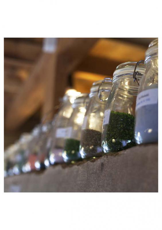 Meerdere kleuren in het glas wordt ingebracht met glaskorrels op kleur.